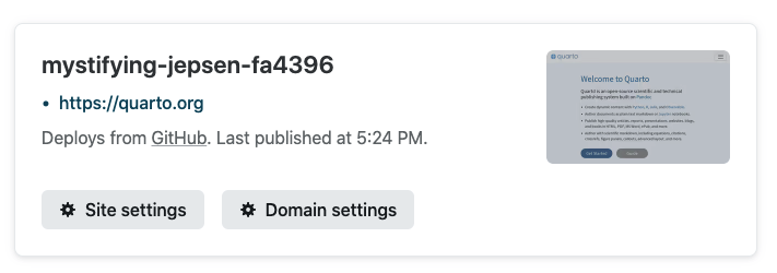 Once you’ve specified your publishing action and Netlify credentials, and pushed your updated repository (including the _freeze directory) to GitHub, your action will run with this and subsequent commits, automatically rendering and publishing to Netlify.