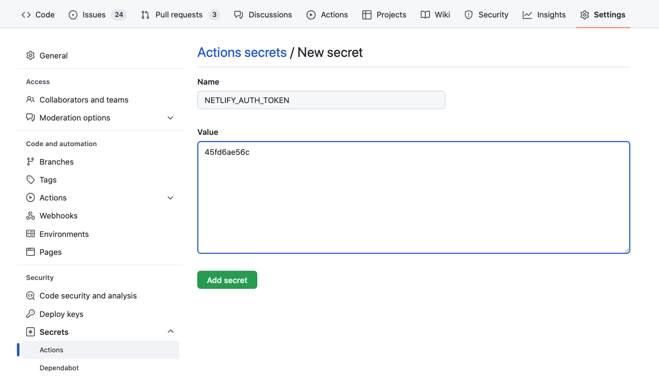 Click the button and add the personal access token from step 1 as a secret named NETLIFY_AUTH_TOKEN: