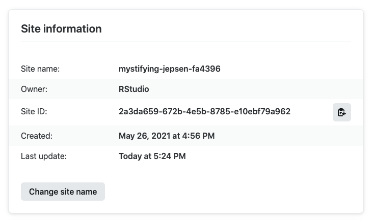 The domain name for your published site will by default use a random identifier (e.g. mystifying-jepsen-fa4396.netlify.app). You can pick a more descriptive sub-domain (still using netlify.app as the main domain) or if you own another domain, assign that one to the site. These options are available (respectively) from the Site settings and Domain settings panels: